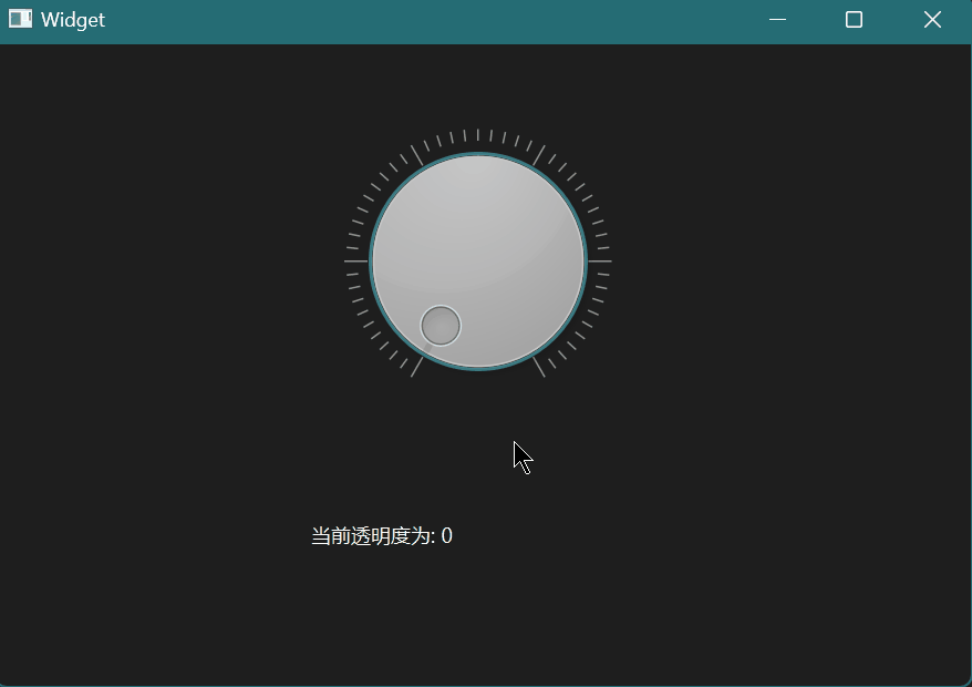 QLabel的初始化显示与QDial的最小值, 最大值, 刻度线等内容;Widget::Widget(QWidget *parent) : QWidget(parent) , ui(new Ui::Widget) { ui->setupUi(this); ui->dial->setMaximum(50); ui->dial->setMinimum(0); ui->dial->setNotchesVisible(true); ui->label->setText("当前透明度为: "+QString::number(ui->dial->value())); } -