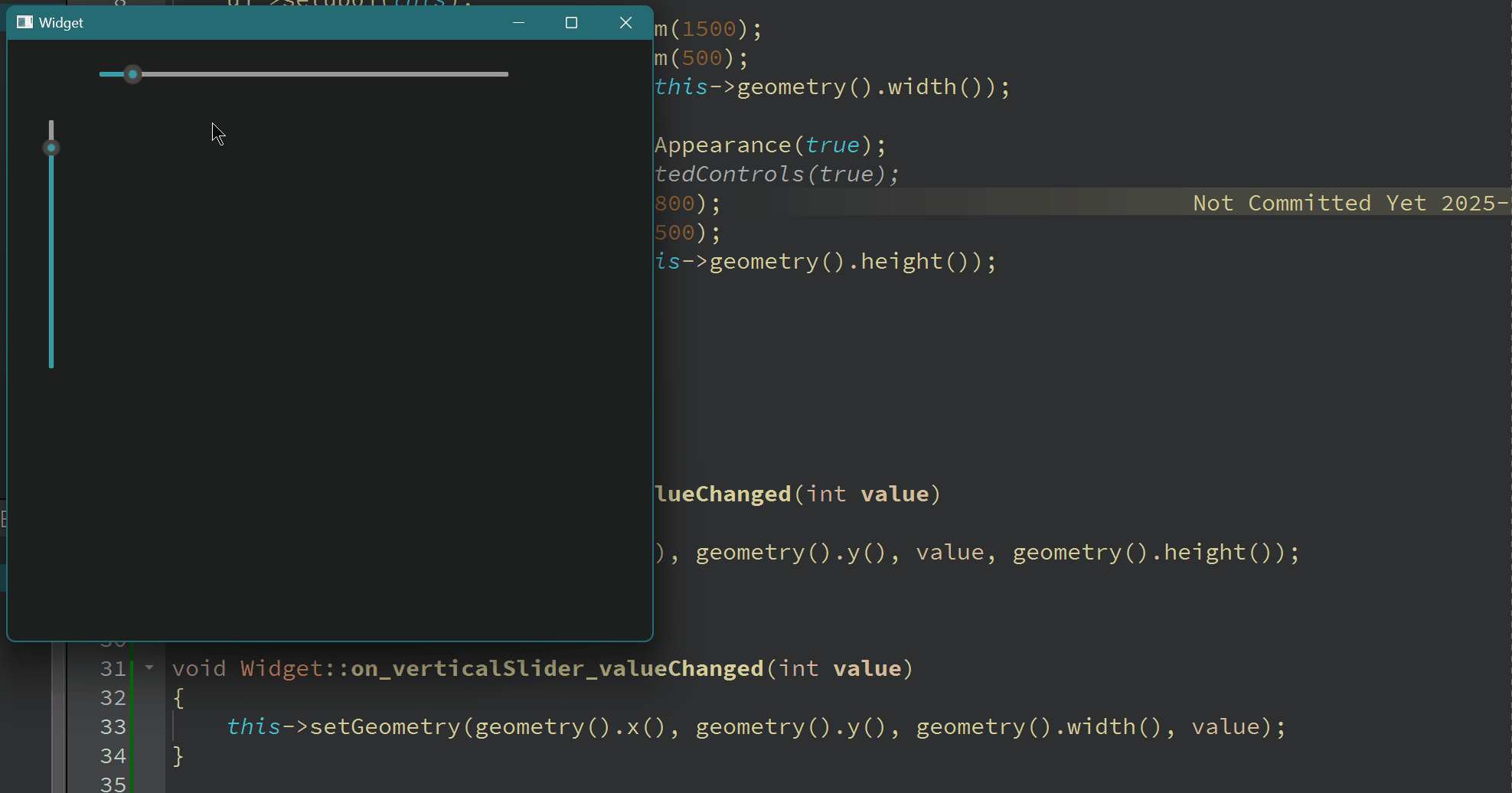 Widget的geometry的宽与高;void Widget::on_horizontalSlider_valueChanged(int value) { this->setGeometry(geometry().x(), geometry().y(), value, geometry().height()); } void Widget::on_verticalSlider_valueChanged(int value) { this->setGeometry(geometry().x(), geometry().y(), geometry().width(), value); } -