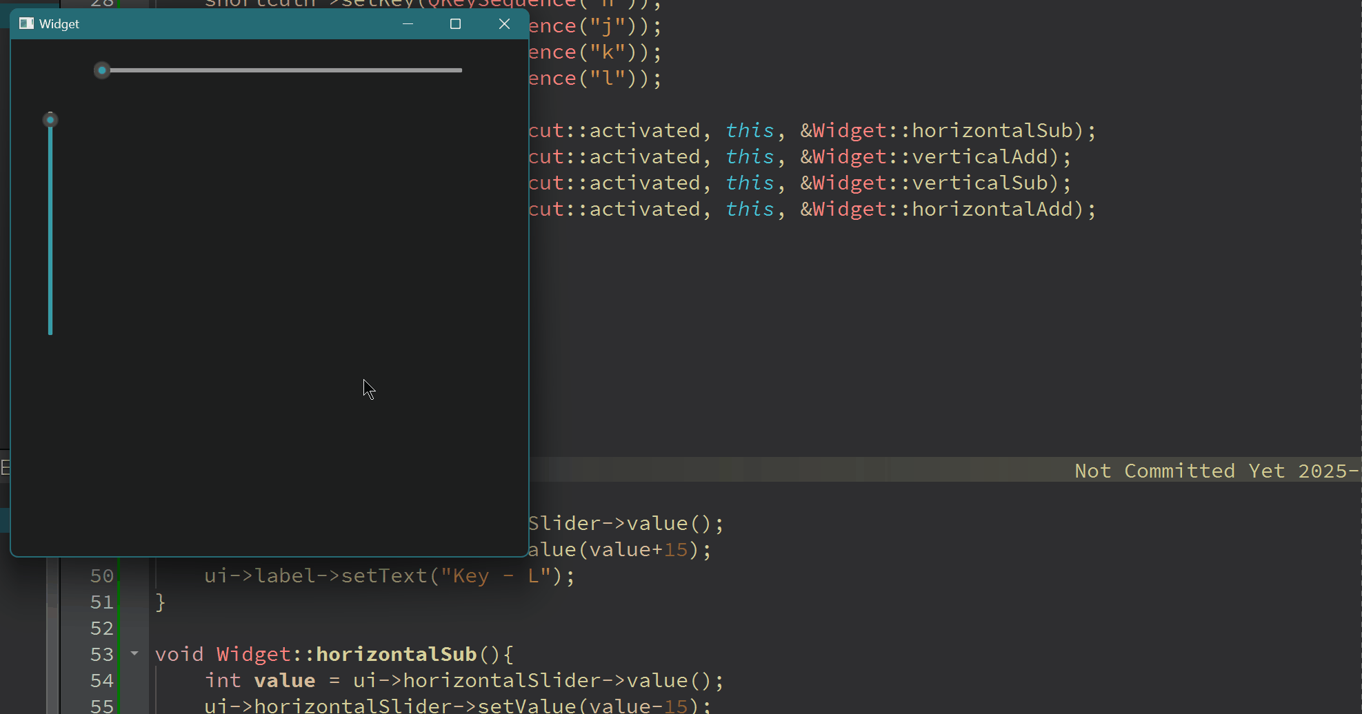 Slider控件的value发生改变时又会触发其ValueChanged()信号, 从而修改Widget的大小;void Widget::horizontalAdd(){ int value = ui->horizontalSlider->value(); ui->horizontalSlider->setValue(value+15); ui->label->setText("Key - L"); } void Widget::horizontalSub(){ int value = ui->horizontalSlider->value(); ui->horizontalSlider->setValue(value-15); ui->label->setText("Key - H"); } void Widget::verticalAdd(){ int value = ui->verticalSlider->value(); ui->verticalSlider->setValue(value+15); ui->label->setText("Key - J"); } void Widget::verticalSub(){ int value = ui->verticalSlider->value(); ui->verticalSlider->setValue(value-15); ui->label->setText("Key - K"); }同时需要注意的是, 我们设置了一个