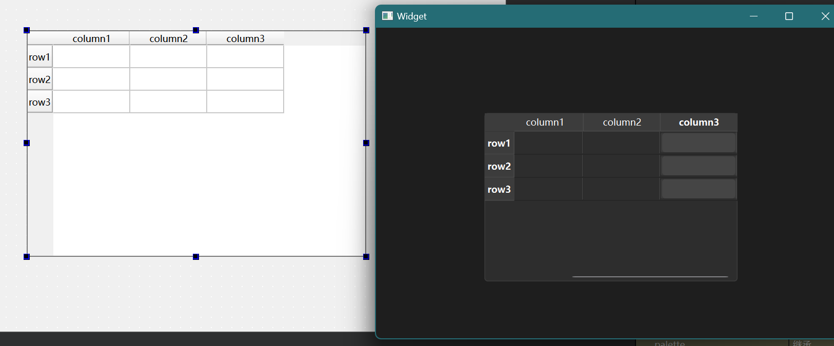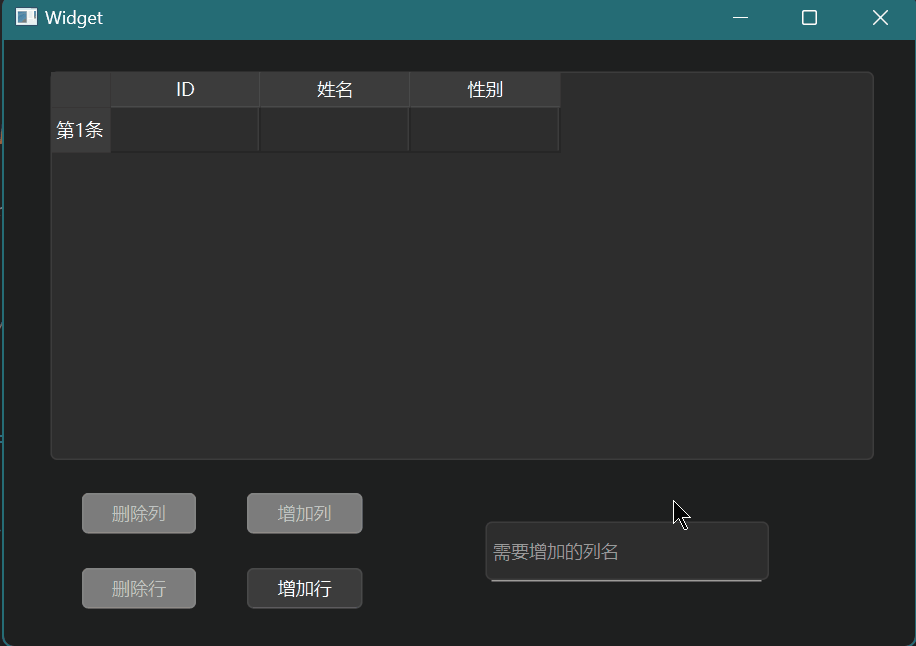 PushButton的禁用状态;void Widget::on_pushButton_addCol_clicked() { /* # 4) 动态增加列 获取输入框内容, 在表格末尾追加一列, 并更新表头文字; */ QString str = ui->lineEdit->text(); // 在当前总列数的位置插入新列(即追加在最后) ui->tableWidget->insertColumn(ui->tableWidget->columnCount()); // 设置新列的表头 ui->tableWidget->setHorizontalHeaderItem( ui->tableWidget->columnCount()-1, new QTableWidgetItem(str)); ui->lineEdit->clear(); // 清空输入框, 方便下一次输入 /* # 5) 更新计数与按钮状态 列数增加后, 如果超过了基础的3列, 则允许使用"删除列"按钮; */ if(ui->tableWidget->columnCount()>3) ui->pushButton_delCol->setEnabled(true); else ui->pushButton_delCol->setEnabled(false); } -