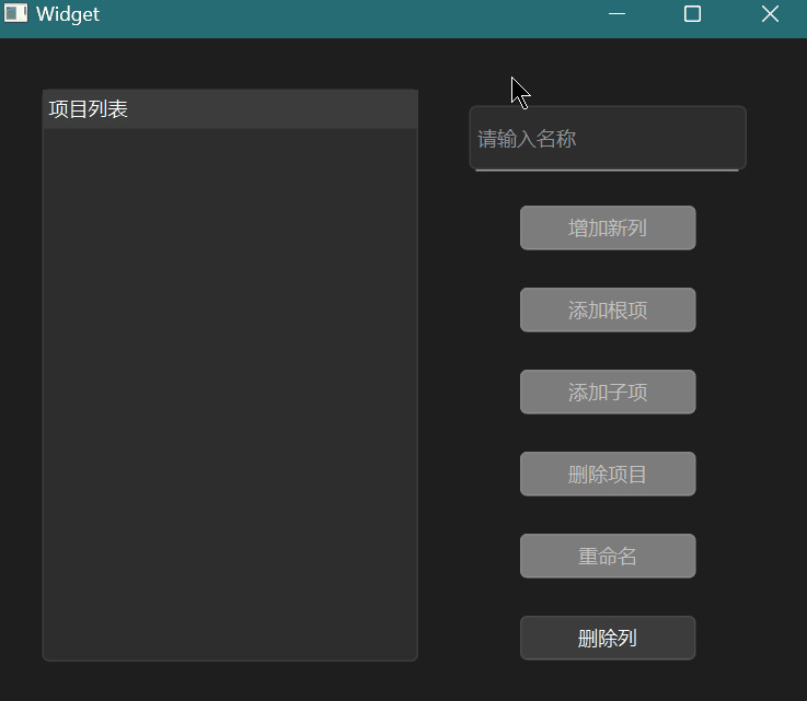 QTreeWidget(核心控件)QLineEdit(输入名称)QPushButton(x6: 添加顶层/子节点/列, 删除列/节点, 重命名)