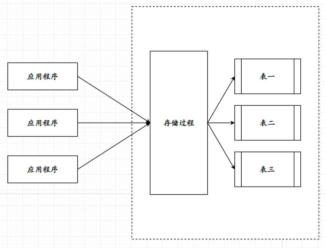 可以从上图看到, 经过封装后, 应用程序只需要调用存储过程即可, 无需再进行复杂的事务编写从而避免了繁杂的事务编写, 多条相同事务的冗余(代码复用低)以及每次语句进入数据库的编译导致的效率低;