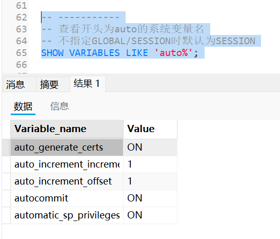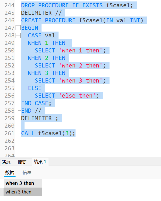 DROP PROCEDURE IF EXISTS f5case1; DELIMITER // CREATE PROCEDURE f5case1(IN val INT) BEGIN CASE val WHEN 1 THEN SELECT 'when 1 then'; WHEN 2 THEN SELECT 'when 2 then'; WHEN 3 THEN SELECT 'when 3 then'; ELSE SELECT 'else then'; END CASE; END // DELIMITER ; CALL f5case1(3);运行结果为: