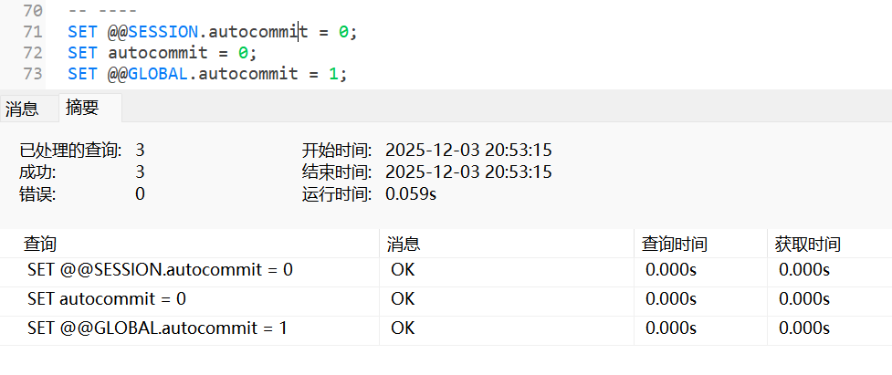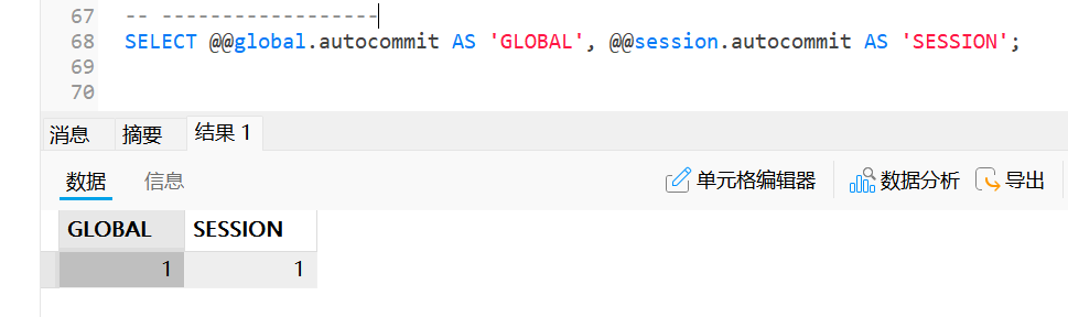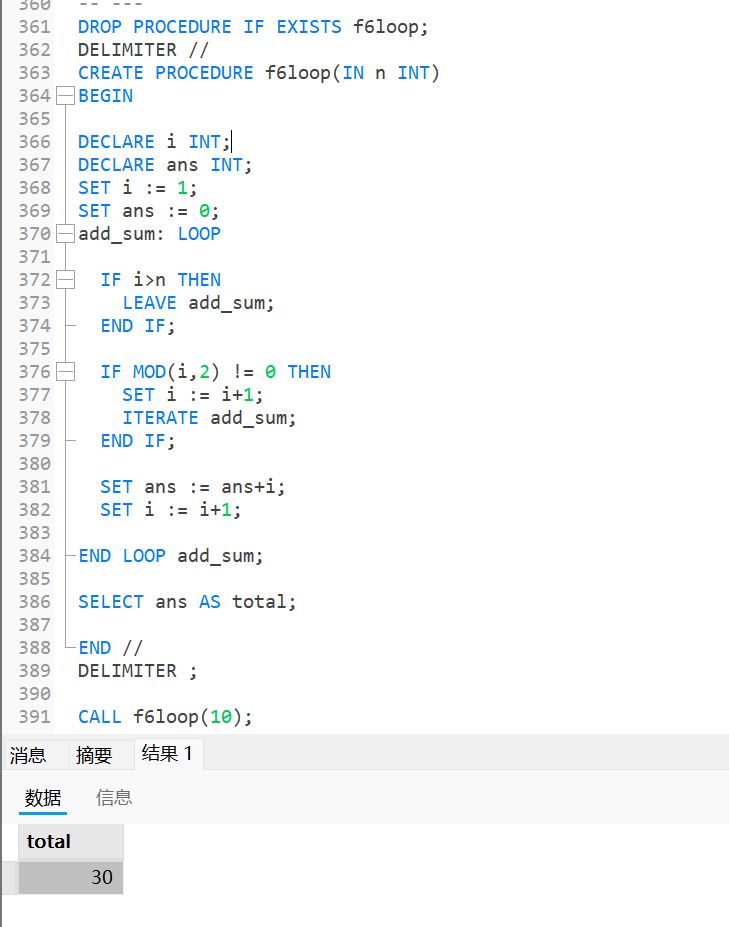 0-n中的偶数进行相加, 奇数则跳过;DROP PROCEDURE IF EXISTS f6loop; DELIMITER // CREATE PROCEDURE f6loop(IN n INT) BEGIN DECLARE i INT; DECLARE ans INT; SET i := 1; SET ans := 0; add_sum: LOOP -- 定义循环体 IF i>n THEN -- 判断结束条件 LEAVE add_sum; END IF; IF MOD(i,2) != 0 THEN -- 判断跳过条件(奇数跳过) SET i := i+1; -- 跳过时也需要自增 ITERATE add_sum; END IF; SET ans := ans+i; -- 累加 SET i := i+1; -- 自增i END LOOP add_sum; -- 循环体结束 SELECT ans AS total; -- 打印累加结果 END // DELIMITER ; CALL f6loop(10);运行结果为: