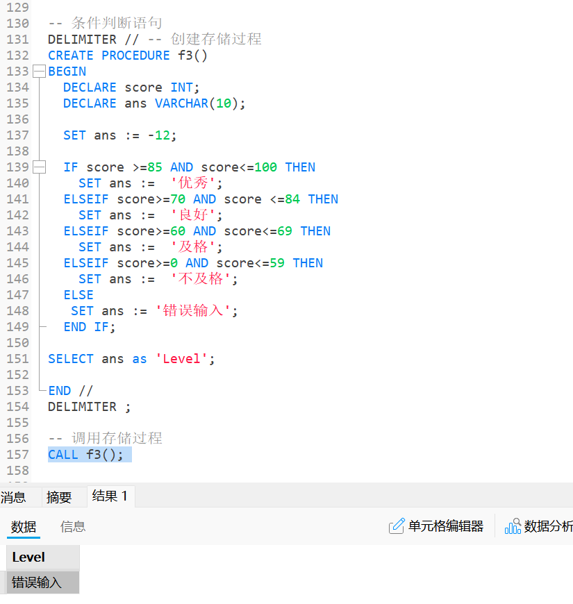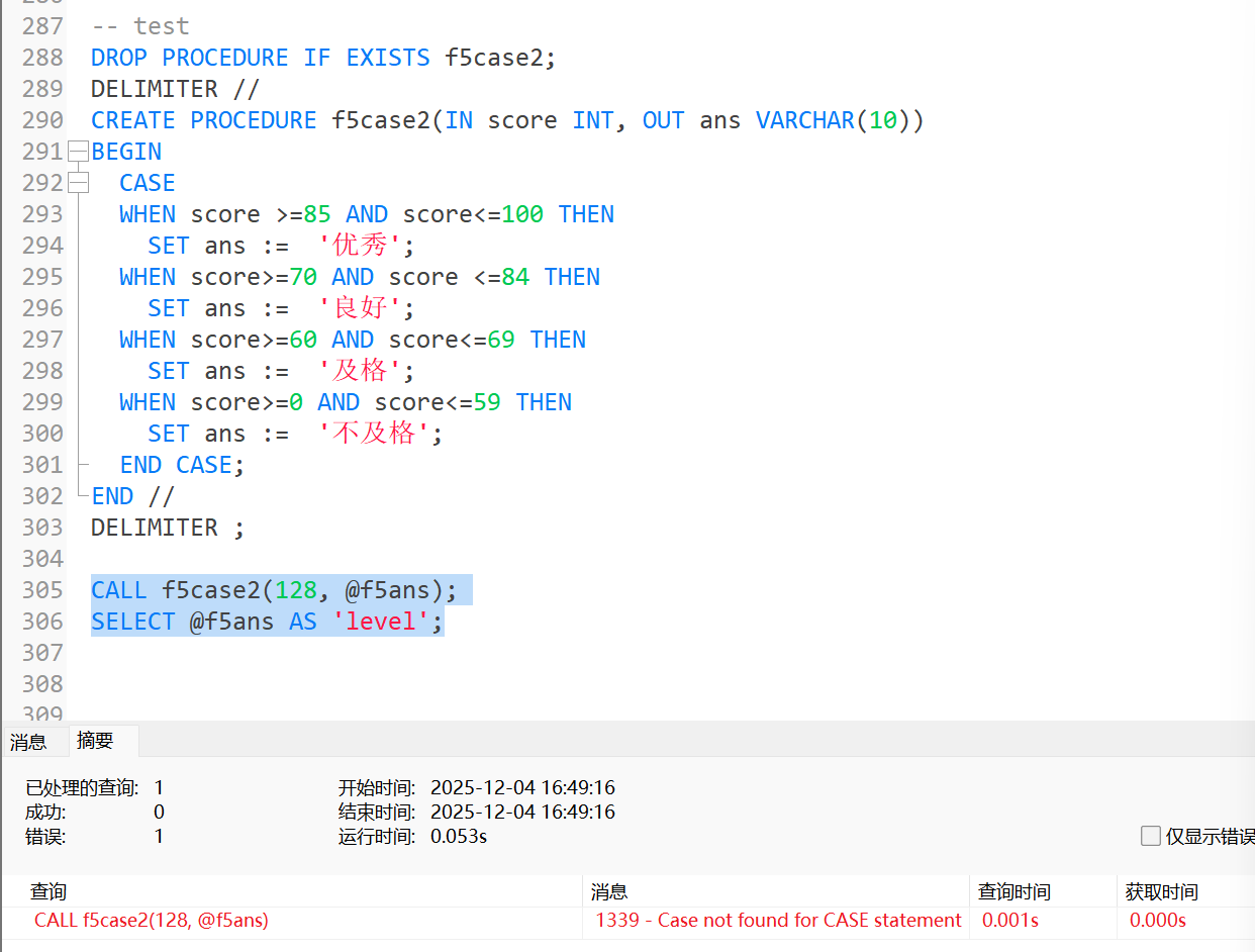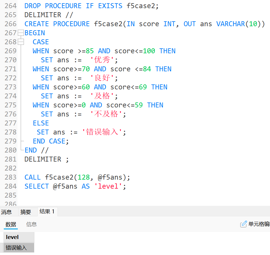 4.1中的内容进行改写:DROP PROCEDURE IF EXISTS f5case2; DELIMITER // CREATE PROCEDURE f5case2(IN score INT, OUT ans VARCHAR(10)) BEGIN CASE WHEN score >=85 AND score<=100 THEN SET ans := '优秀'; WHEN score>=70 AND score <=84 THEN SET ans := '良好'; WHEN score>=60 AND score<=69 THEN SET ans := '及格'; WHEN score>=0 AND score<=59 THEN SET ans := '不及格'; ELSE SET ans := '错误输入'; END CASE; END // DELIMITER ; CALL f5case2(128, @f5ans); SELECT @f5ans AS 'level';运行结果为: