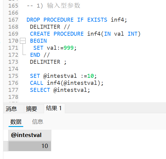 当存储过程传入一个IN类型的参数时, 相当于传值传参, 进入存储过程的参数只是一个临时拷贝, 形参不影响实参;