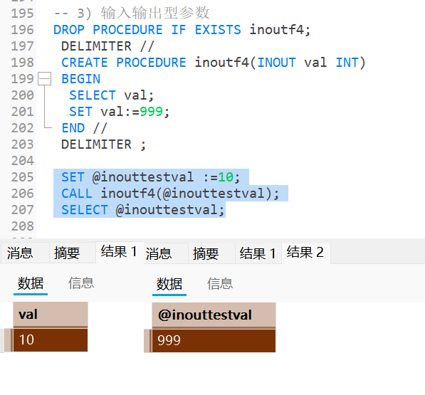 当存储过程传入一个INOUT参数, 相当于进行传引用传参, 该参数既能当做输入型参数, 也能作为输出型参数;