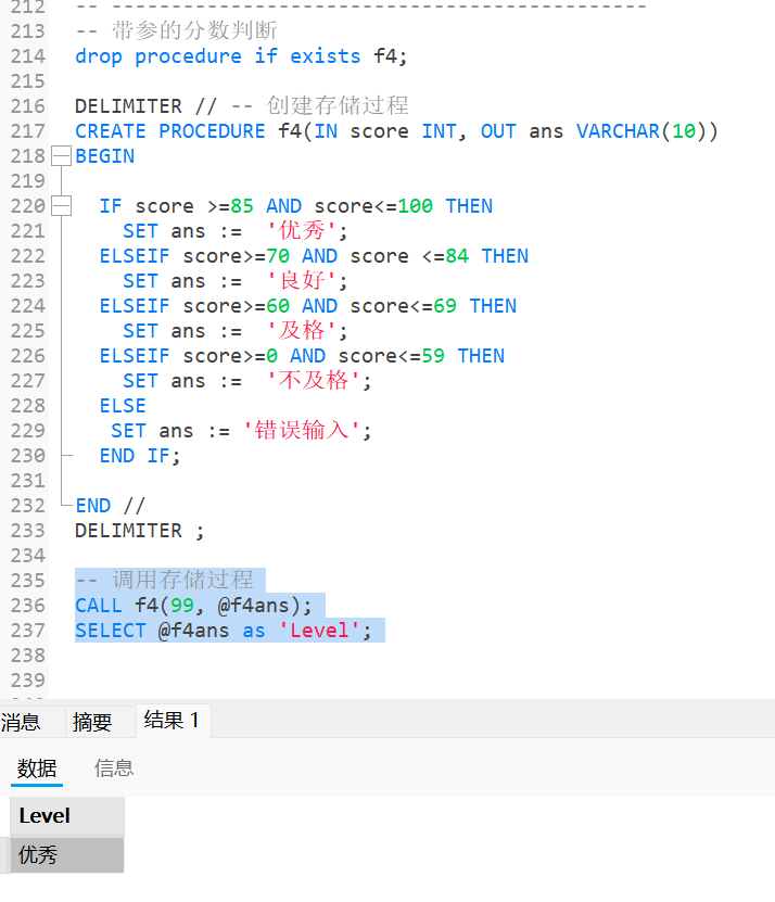 CREATE PROCEDURE f4(IN score INT, OUT ans VARCHAR(10))