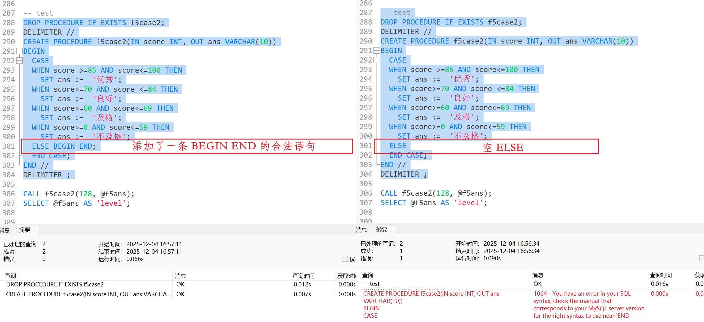 当然, 当若是出现对应的空ELSE条件, 我们需要为其加上一条空语句或者无效语句, 如BEGIN END, 这是一个合法的空语句, 否则也可能出现报错;