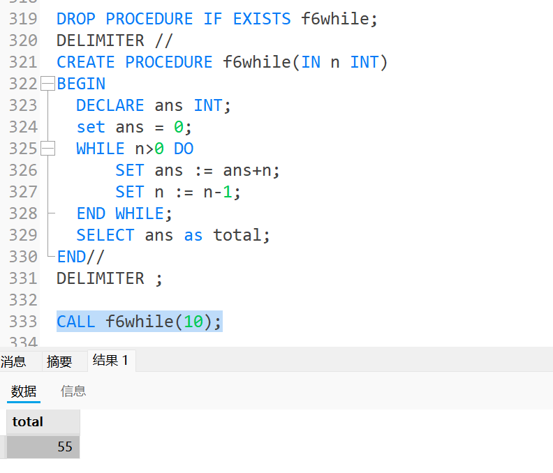 1加到n;DROP PROCEDURE IF EXISTS f6while; DELIMITER // CREATE PROCEDURE f6while(IN n INT) BEGIN DECLARE ans INT; set ans = 0; WHILE n>0 DO SET ans := ans+n; SET n := n-1; END WHILE; SELECT ans as total; END// DELIMITER ; CALL f6while(10);运行结果为: