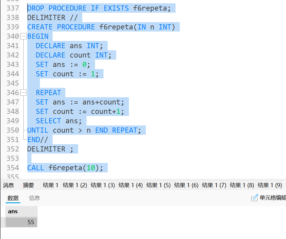 n, 并打印其i累加至n的值;DROP PROCEDURE IF EXISTS f6repeta; DELIMITER // CREATE PROCEDURE f6repeta(IN n INT) BEGIN DECLARE ans INT; DECLARE count INT; SET ans := 0; SET count := 1; REPEAT SET ans := ans+count; SET count := count+1; SELECT ans; UNTIL count > n END REPEAT; END// DELIMITER ; CALL f6repeta(10);运行结果为: