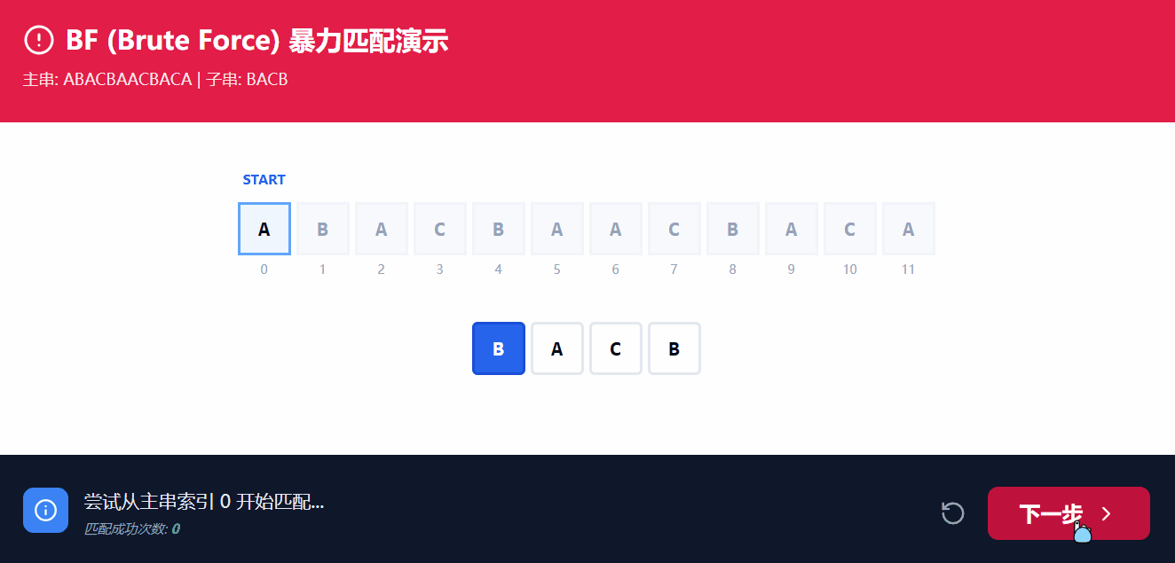 BF解法的核心思路就是, 以双指针对两个数组同时进行遍历, i遍历主串, j遍历子串, 逐个枚举;