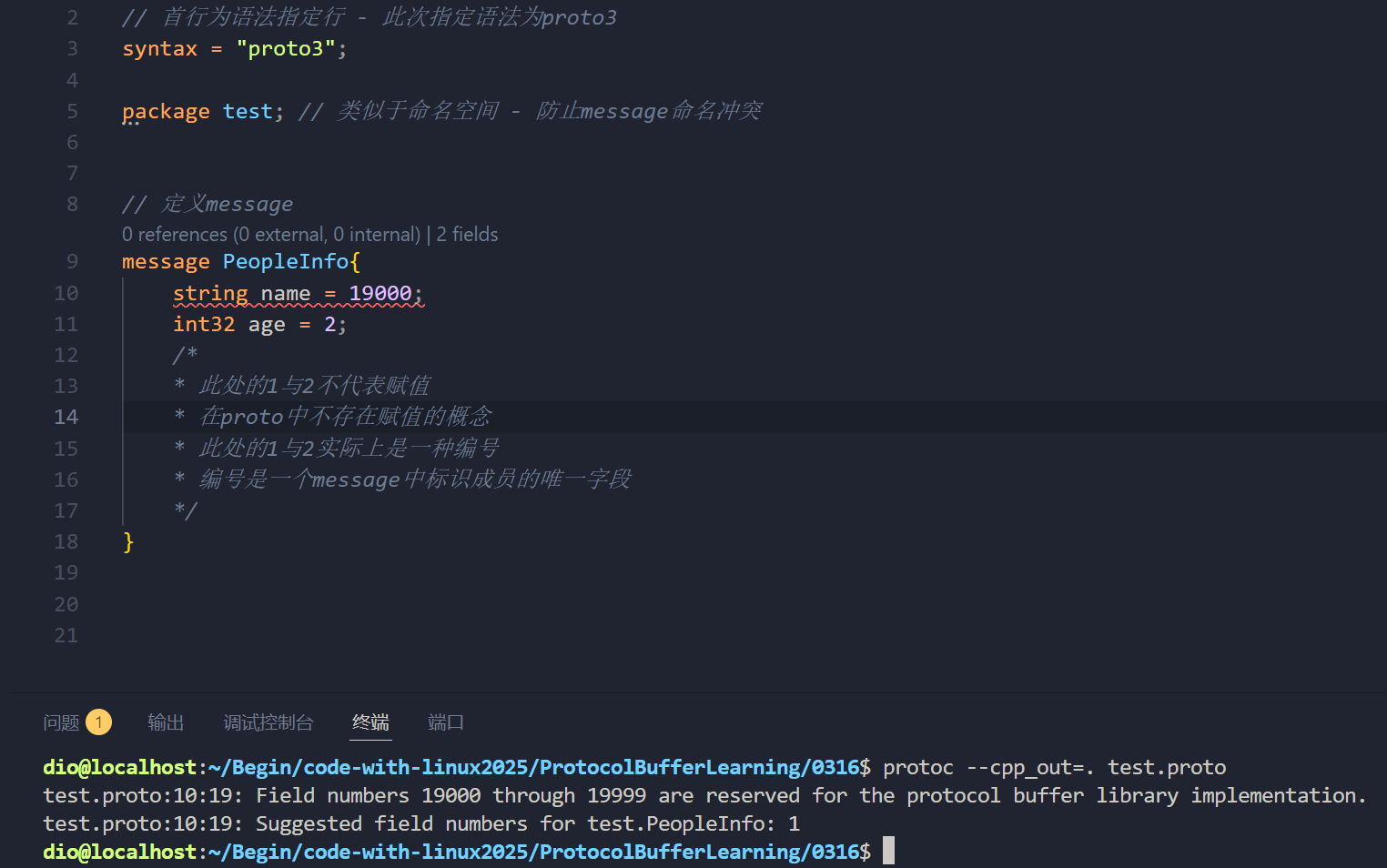 其次是在注释中提到了=符号跟着的是编号而不是赋值, 本身Protobuf无赋值概念, 在一个message中, 编号是用于表明某个字段的唯一性, 在一个message中, 两个字段不能使用相同的编号, 也不能使用相同的成员名;