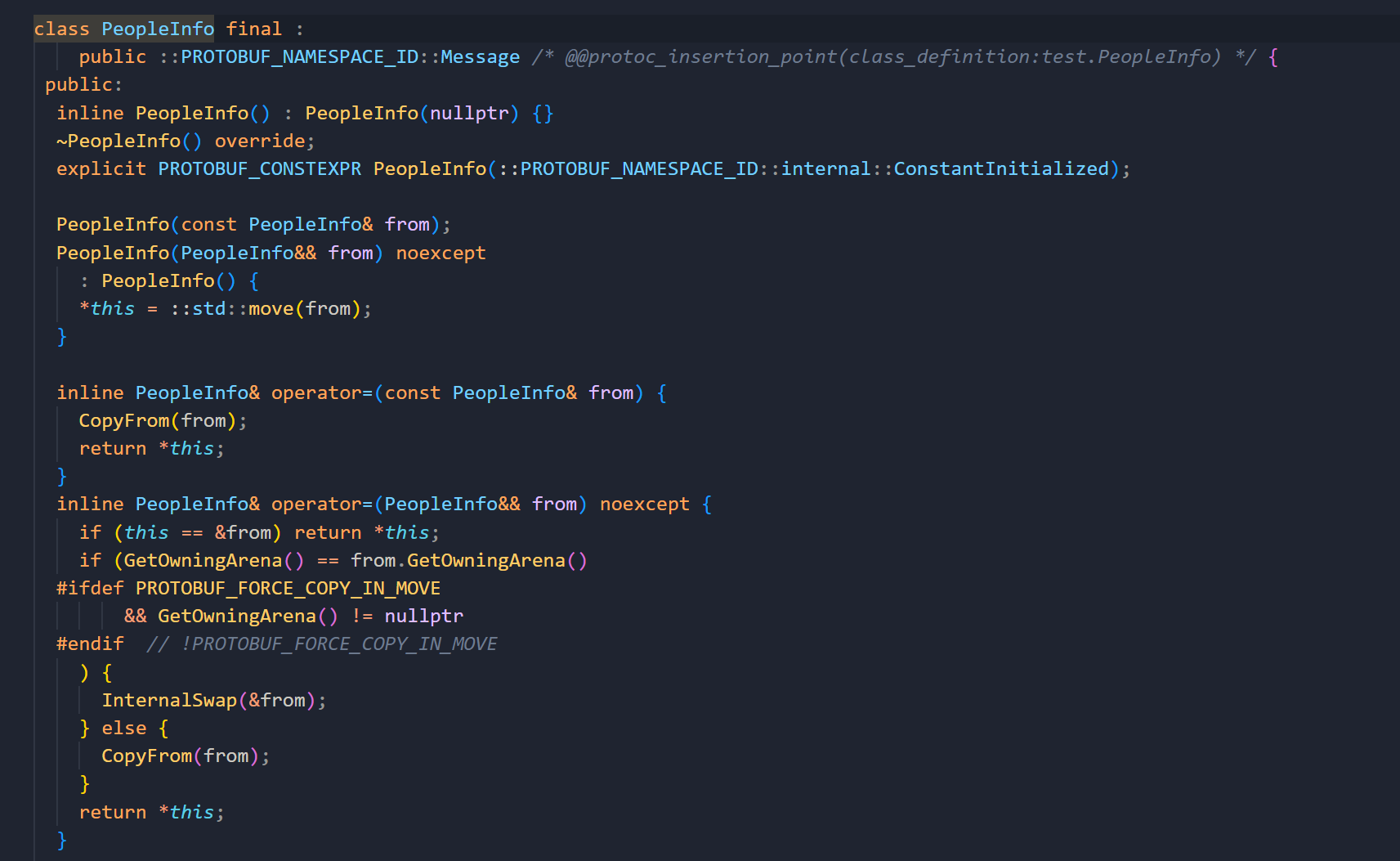 当.proto文件编译过后, 将会生成对应的.cc/.h文件, 这两个文件中, 以.h文件为例, .proto中定义的message将会被编译为对应的class, 其中class命名与.proto的命名相同, 且在这个class中将存在一些其他内容, 具体来说, 对应的内容为: